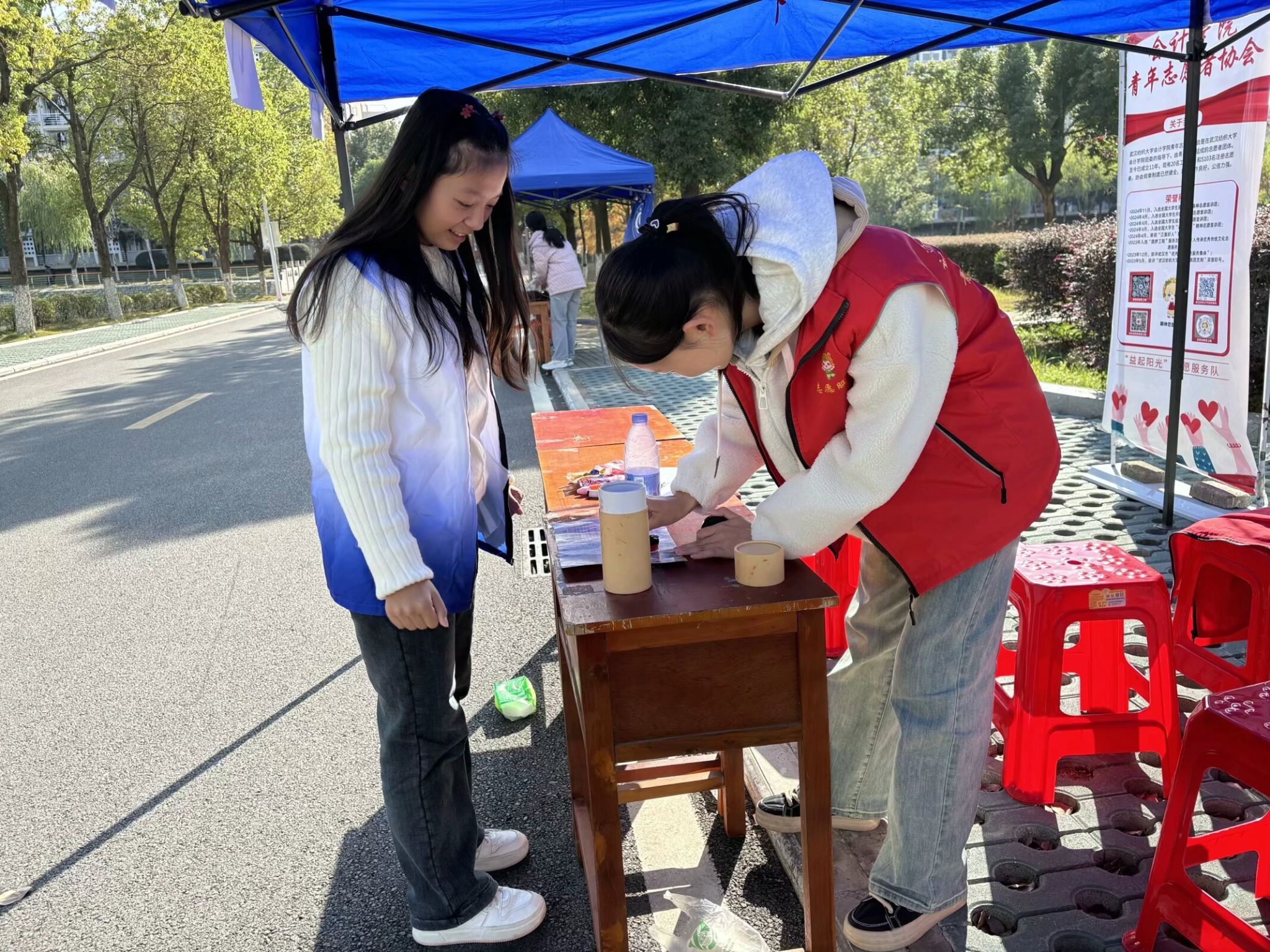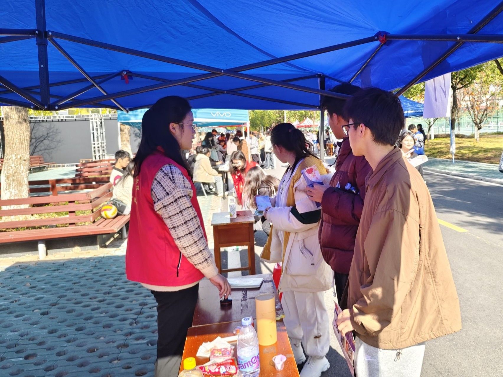 图为志愿者为游戏过关的同学盖章