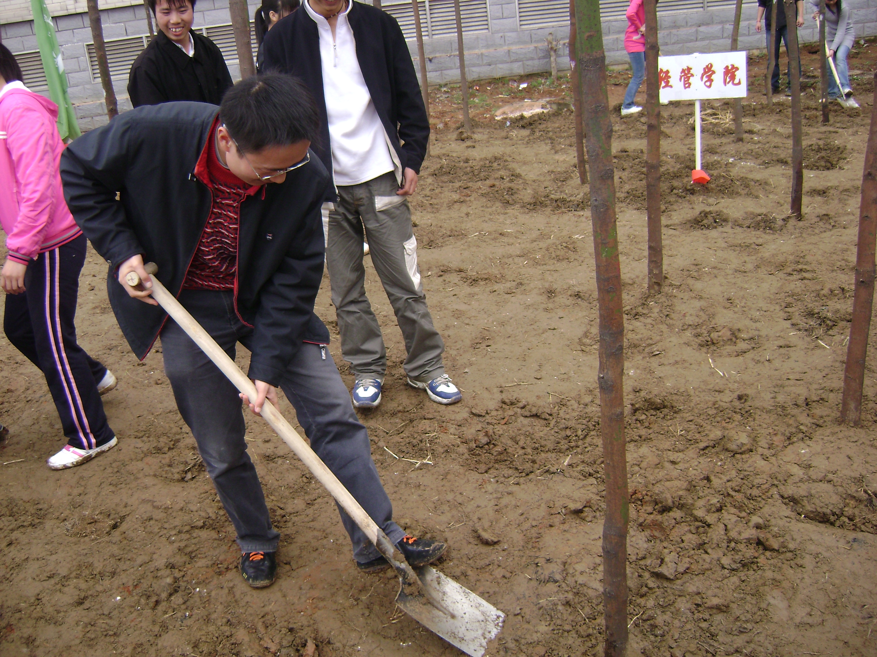13日下午2:00,校领导,各相关部门工作人员,各院系老师、辅导员以及学生,齐聚现代教育中心旁的植树区,现场有序地插着各院系的院旗,气氛相当活跃。虽不是植树节当天,但全体师生的热情丝毫不受影响,个个干得热火朝天,直到活动圆满结束。