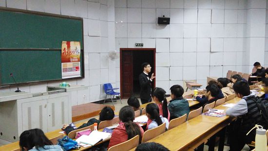 2015年11月12日晚7点,龙席电商电商咨询事业部总经理陈涛应邀在我校阳光校区07-T302作了一场题为“正青春”的专题讲座。bat365正版唯一官网杜进、何国正老师、毕业班辅导员程鹏和近300名学生参加了本次讲座。