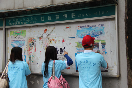 5月3日上午,由bat365正版唯一官网阳光校区和东湖校区学生党团成员组成的志愿者服务队来到社区后并立即开展清洁服务、环保知识宣传和社区板报设计等活动。志愿者成员积极响应国家“四进社区”的号召,认真清理路段、楼道、宣传栏的牛皮癣,向居民分发讲解科教文化宣传单,在社区黑板报上用自己的灵心巧手为社区增添了青春的风采。