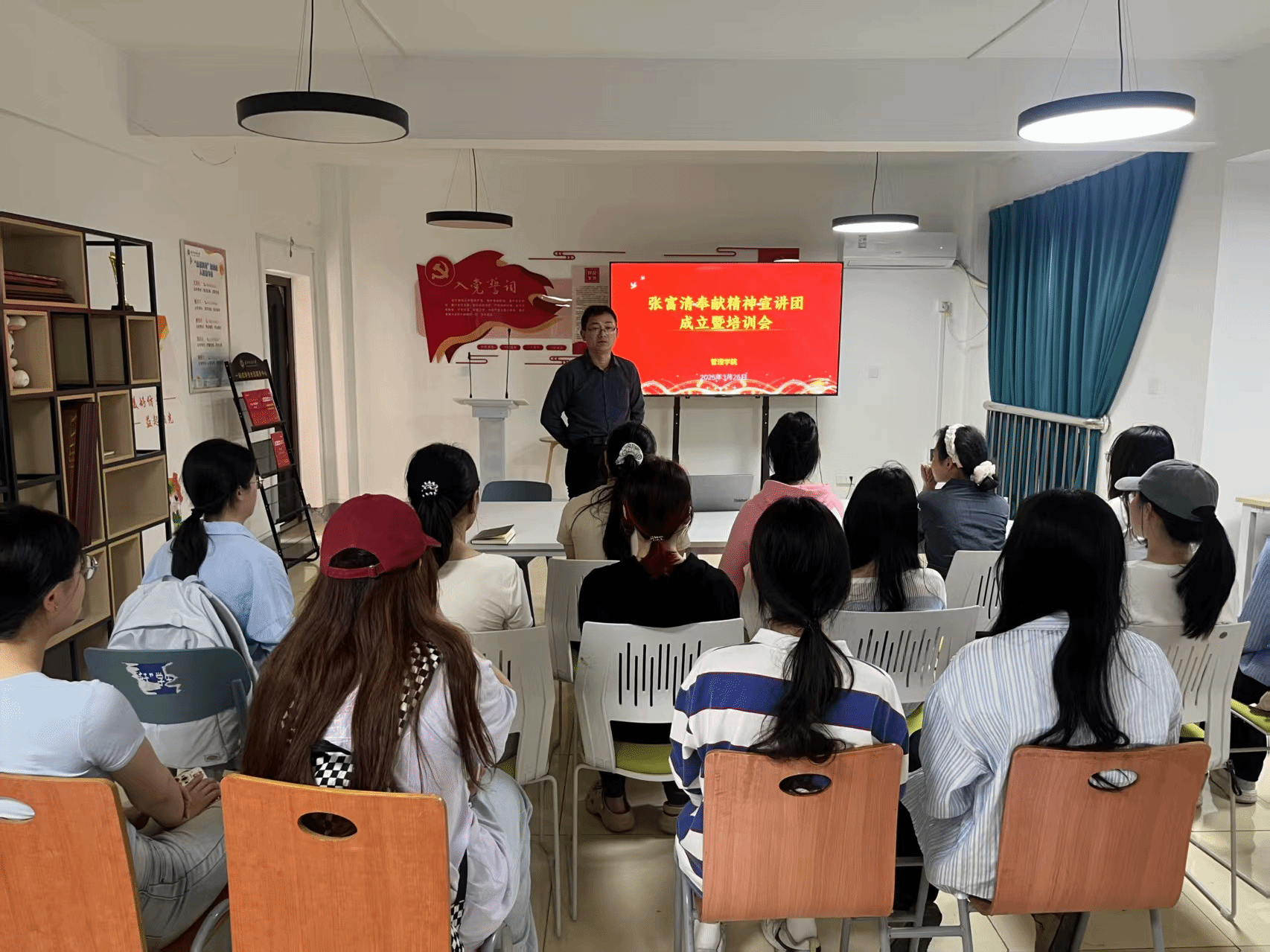 成立仪式上,古江波通过分享学院赴湖北恩施来凤县学习张富清事迹的亲身经历,向大家讲述了张富清同志深藏功名、扎根基层的奉献精神,讲述了学院成立张富清奉献精神宣讲团的初衷。同时,他还就宣讲团成员怎样讲好张富清故事提出了三点要求:一是希望大家先学一步、深悟一层,要多研读史料、走访调研,挖掘张富清同志平凡中的伟大、抉择中的坚守;二是希望大家创新表达、贴近群众,用“青年语”讲“国家事”,用差异化的语言表达体系,确保各受众群体的理解和接受,让张富清奉献精神可感、可知、可学;三是希望大家知行合一、躬身实践,宣讲不是终点而是起点,主动学、用心讲、务实做,“做”我所“讲”、“讲”我所“做”。