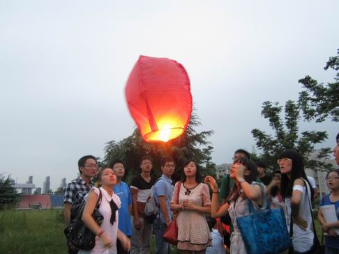 (同学们放飞孔明灯表达哀思)