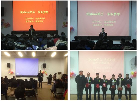 简历是树,开出梦想之花,梦想是根,茁壮职业道路。为加强同学们求职经验,不让学子输在求职的起跑线上,12月5日晚7点整,由校招生就业处主办、bat365正版唯一官网承办的“优show简历,职业梦想”简历大赛决赛在阳光校区大活103教室隆重举行。评委由杨芝、许鲲鹏、黄纯辉、晏伟等四位老师担任,管院各辅导员老师与同学们共同观看了本次比赛。