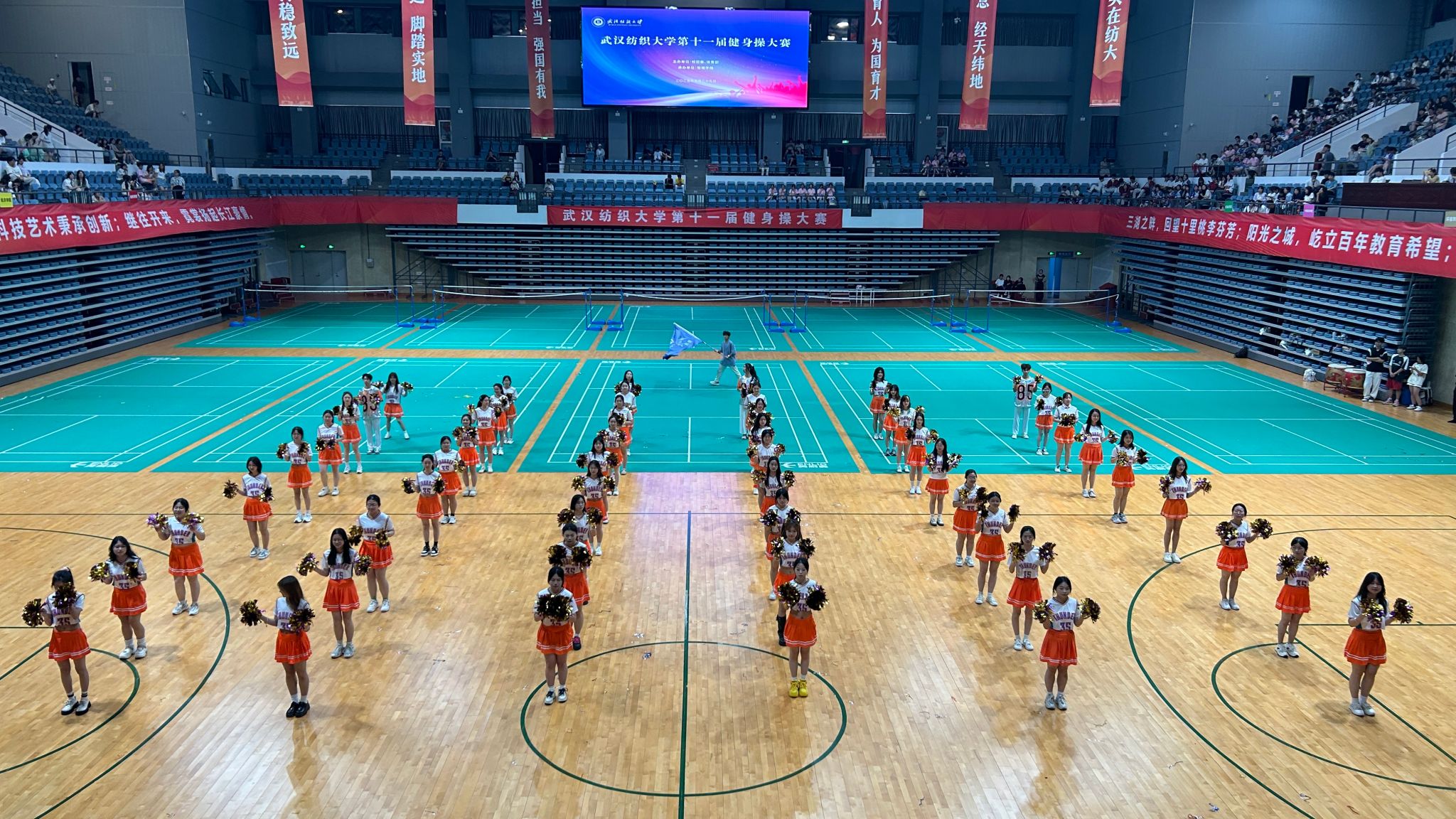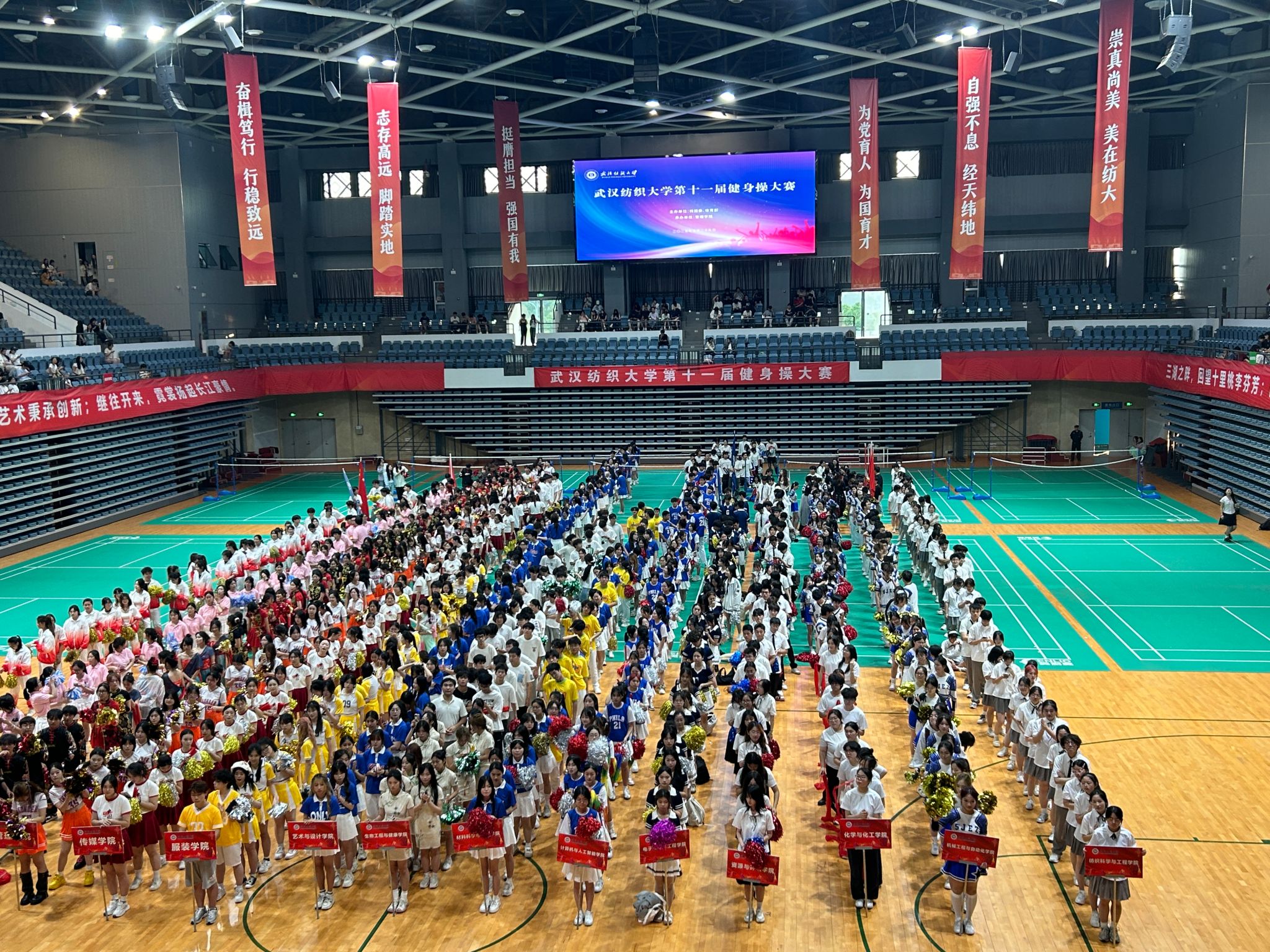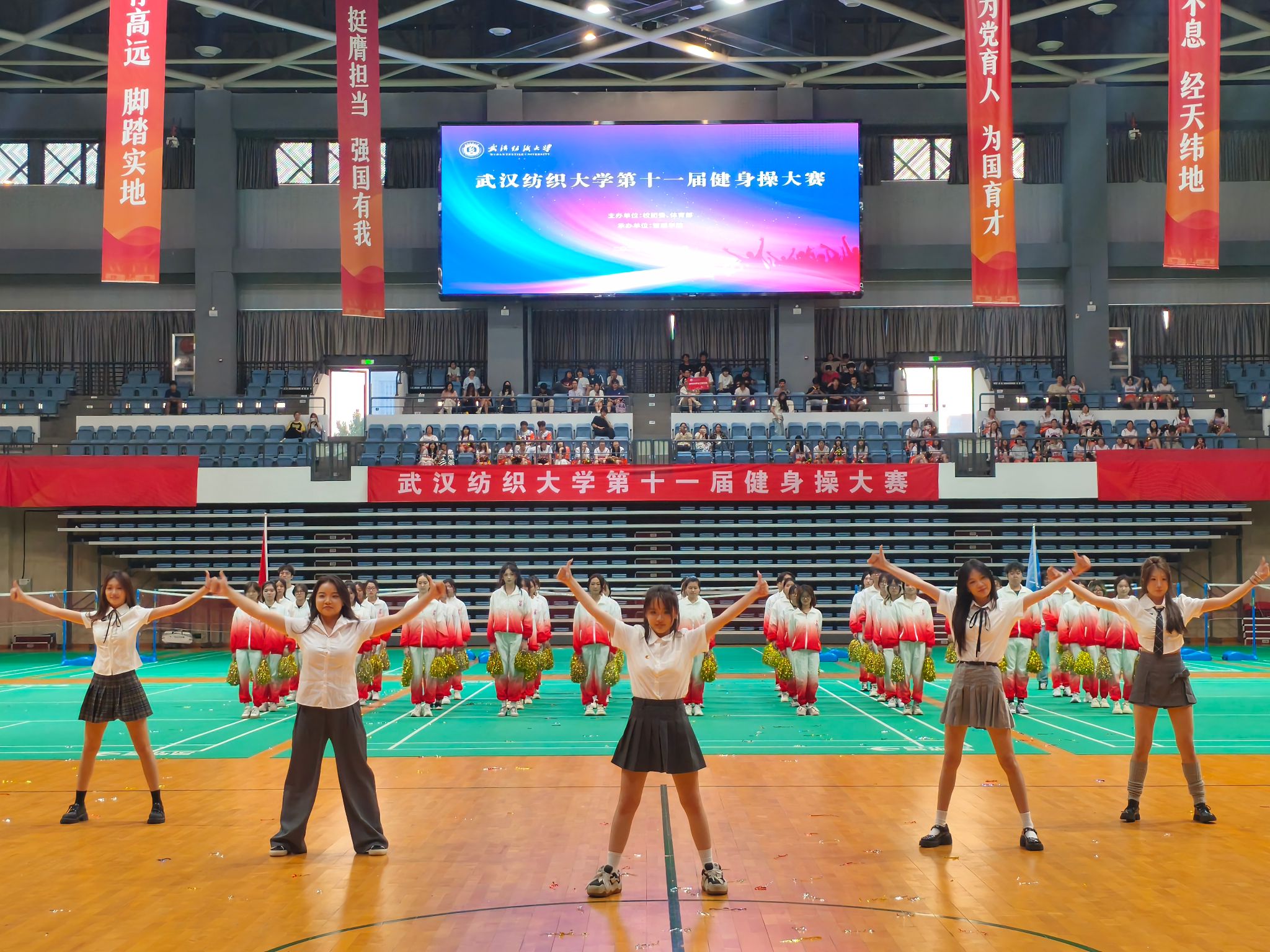 近日,由校团委、体育部主办、bat365正版唯一官网承办的第十一届bat365正版唯一官网健身操比赛在我校阳光校区体育馆如期举行。校党委副书记、副校长罗锦银莅临现场指导,校团委、体育部、bat365正版唯一官网等职能部门领导和学院负责人以及各学院副书记出席活动,与2000余名师生共同见证这场展现纺大青春风采的体育盛会。