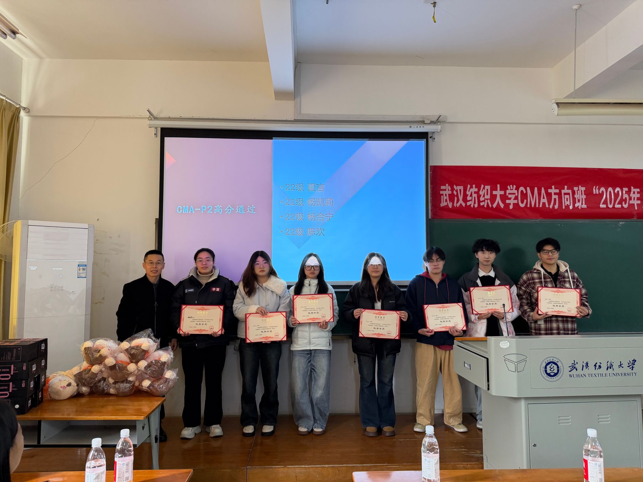随后,高顿教育谢晖经理为“CMA-P2 考试通过奖”获奖学员颁奖。22级刘佳一、向雪丽、张恩浩、吴慧萱、邓翔天、张艺轩、陈鲸后、黄秋燕等同学凭借扎实的专业功底顺利通过考试,他们在台上与颁奖嘉宾合影留念,笑容中洋溢着奋斗后的喜悦。