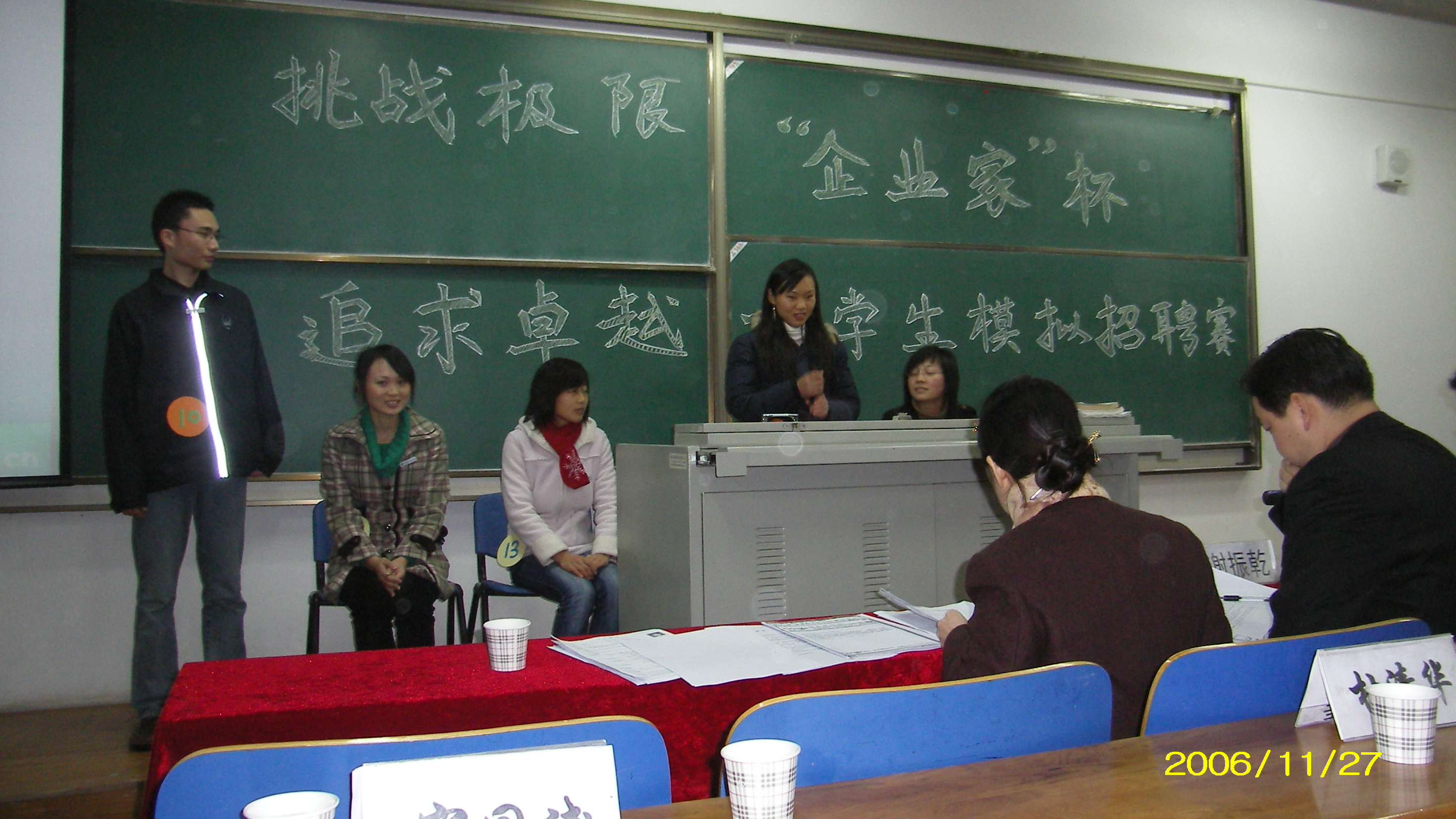 2006年11月27日晚7点,由经济bat365正版唯一官网主办的第一届"企业家"杯大学生模拟招聘大赛在阳光校区03-118教师举行。中商集团人事总监谢振乾先生、毕业指导中心晏伟老师和欧铭红老师被邀请坐席评委。经管院鲁开建副书记及各年级辅导员被邀请担任此次大赛嘉宾。