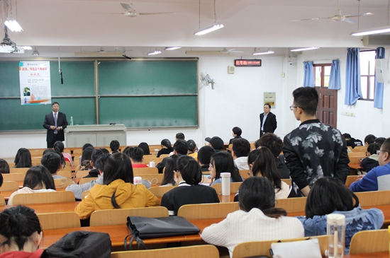 徐廷光先生首先为同学们讲述了他个人的成长经历,展示了他从大学毕业到工作这段时间的人生变化历程,告诫在座同学们要志存高远、脚踏实地、坚持不懈,人生的起点虽然无法选择,但是努力奔跑可能提高自己的终点。接着,徐先生告诉同学们成功需要善于学习、 敢于决策、敢于担责、舍得放弃、超期望工作、与人融洽相处、具有团队意识、学会忍受委屈、学会做人这八大点。