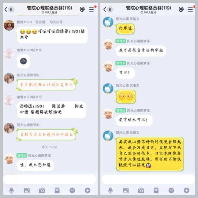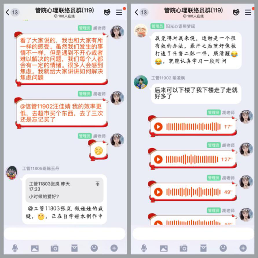 师者,所以传道授业解惑也,胡老师跟我们分享了,自己在疫情期间因为手受伤,长时间休息,而产生空虚焦虑心理,使同学们产生共鸣,引导同学们思考焦虑,之后胡老师谈到自己如何克服焦虑的方法,从控制手机入手,逐步的减少自己内心的烦躁从而达到解决焦虑的问题。