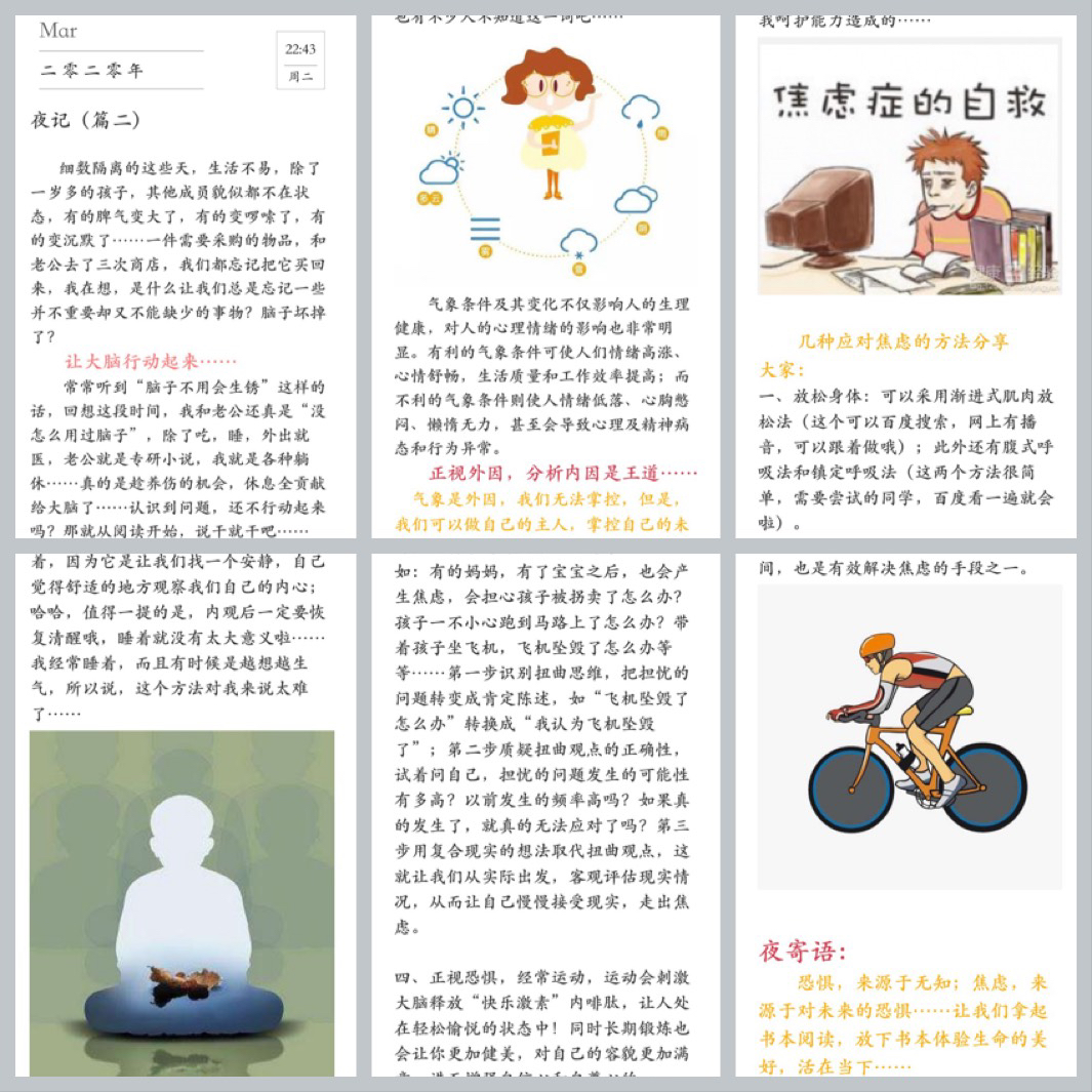 焦虑,跟我们每个人都有关系,胡老师告诉我们,恐惧,来源于无知,焦虑来源于对未来的恐惧。深度剖析了焦虑,让同学们感受到焦虑也不是不可战胜的。朱德庸说:“我们焦虑,是因为我们成为不了我们希望成为的人;我们焦虑,因为我们也不知道自己想成为什么样的人。”所以焦虑让我们更有动力去面对真实的自己和现在的生活。当我们觉得自己的内心很压抑很烦躁,可以尝试很多的方法。这里我们摘录了胡惠老师夜记中的些许方法: