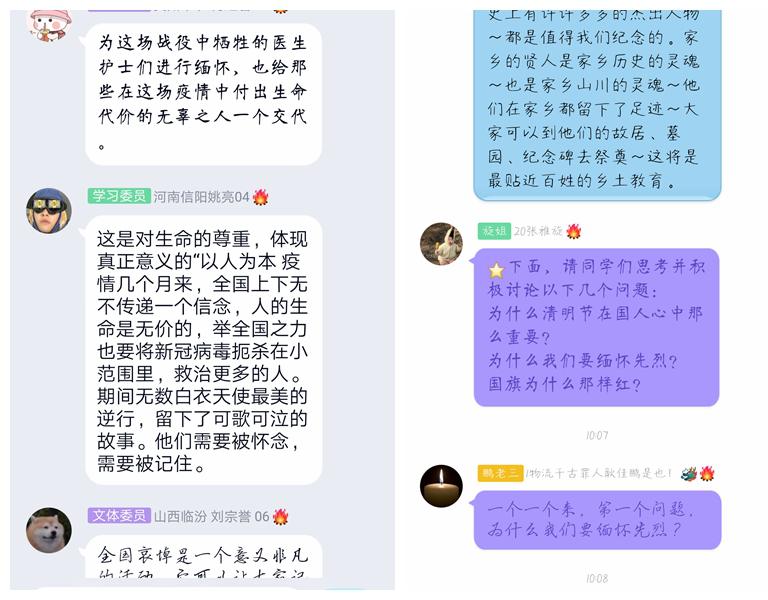 在班级群,同学们纷纷发表个人所思所想,致敬在抗击新冠肺炎疫情中牺牲在战斗一线的“逆行英雄”。别样清明一样情,让我们用齐心共克时艰,告慰逝者!