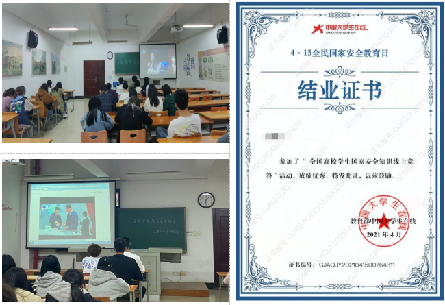 根据校党委学工部《关于在我校学生中开展2021年国家安全教育日主题活动的通知》要求,各班班委以《国家安全法》、《反间谍法》、《反恐怖主义法》为主要内容在班级进行宣传教育,并集中观看了湖北广播电视台理论热点节目《我说国家安全》。随后,各班级结合学习的国家安全知识,组织学生参与“激昂青春,守护安全”全国高校学生国家安全知识线上竞赛活动,进一步学习和了解国家安全知识。最后,同学们围绕国家安全、校园安全、个人发展等进行讨论和思考,并结合校园贷和电信网络诈骗等危害学生财产和人身安全的话题展开热议。
