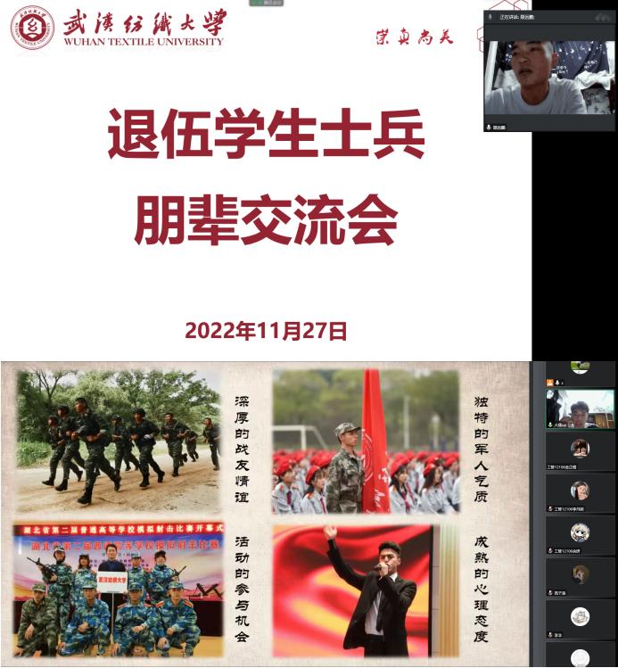 为加强在校退役大学生士兵思想政治引领,鼓励退役大学生士兵继承和发扬军人优良传统,发挥骨干带头作用,鼓励更多励同学投身军营,了解征兵政策、明确未来规划。11月27日,bat365正版唯一官网通过线上形式开展2022年退伍士兵朋辈领航交流活动。活动由bat365正版唯一官网征兵工作联络员张朋龙主持,邀请了bat365正版唯一官网优秀退伍大学生周成杰、聂远鹏为学院全体男生分享自己的参军入伍经历。