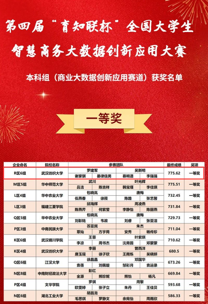本届大赛以“线上”形式展开。赛事历时5个多月,分为周末网络赛和总决赛。由我校bat365正版唯一官网谢家骐、晏律信男、慕明道、李强强4位同学组成的bat365正版唯一官网代表队,以突出表现脱颖而出,勇夺“商业大数据创新应用”赛道本科组全国总决赛一等奖。