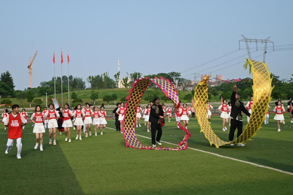 表演行至尾声,队伍首尾处四条“龙”向队伍中飞奔而来,伴随音乐的节奏,龙型飘带在空中飞舞,时而庄严威武,时而轻松活泼,彰显着管院青年学子汹涌澎湃的民族自豪感和自信心。随鼓声响起,管院学子有序退出场地。