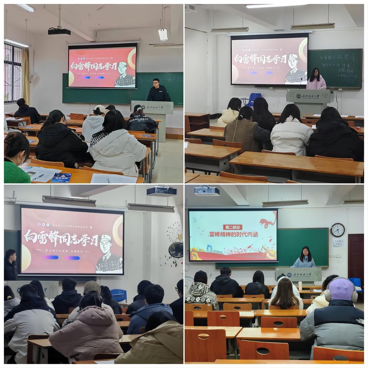 各班团支书为同学们介绍了雷锋的生平事迹,用生动的事例向同学们介绍新时代雷锋精神的内涵,热爱党、热爱祖国、热爱社会主义的崇高理想和坚定信念;服务人民、助人为乐的奉献精神;干一行爱一行、专一行精一行的敬业精神;锐意进取、自强不息的创新精神;艰苦奋斗、勤俭节约的创业精神。雷锋身上所具有的信念的能量、忘我的精神、进取的锐气,正是我们民族精神的最好写照,无论时代如何变迁,雷锋精神永不过时。为更好地学习雷锋精神,学院提倡每个人为身边的同学、老师、服务人员做一件力所能及的小事,如坚持打扫宿舍卫生、积极参加校园志愿服务活动、参与3.12植树护绿活动等,以实际行动传承和弘扬新时代雷锋精神。
