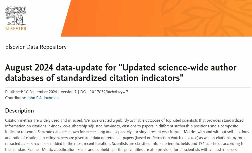 该榜单是斯坦福大学John P. A. Ioannidis教授团队与Elsevier与合作的项目成果,发布在Elsevier旗下的Mendeley Data网站上。榜单基于Scopus数据库的引用数据系统分析,以被引数(区分自引和他引,提供自引数据)、H指数、HM因子等6种综合指标 (composite scoe,C-score),根据 “生涯影响力”和“年度影响力”从近700万名科学家中遴选出世界排名前2%的科学家,分为22个领域和176个细分子领域。榜单提供了面向科学家长期科研表现的衡量指标,客观真实反映科学家的学术影响力。入选全球前2%顶尖科学家榜单,意味着该学者在其研究领域具有较高的世界影响力,为该领域的发展作出了杰出贡献。今年中国有27165位学者入选“2024年年度影响力榜单”。