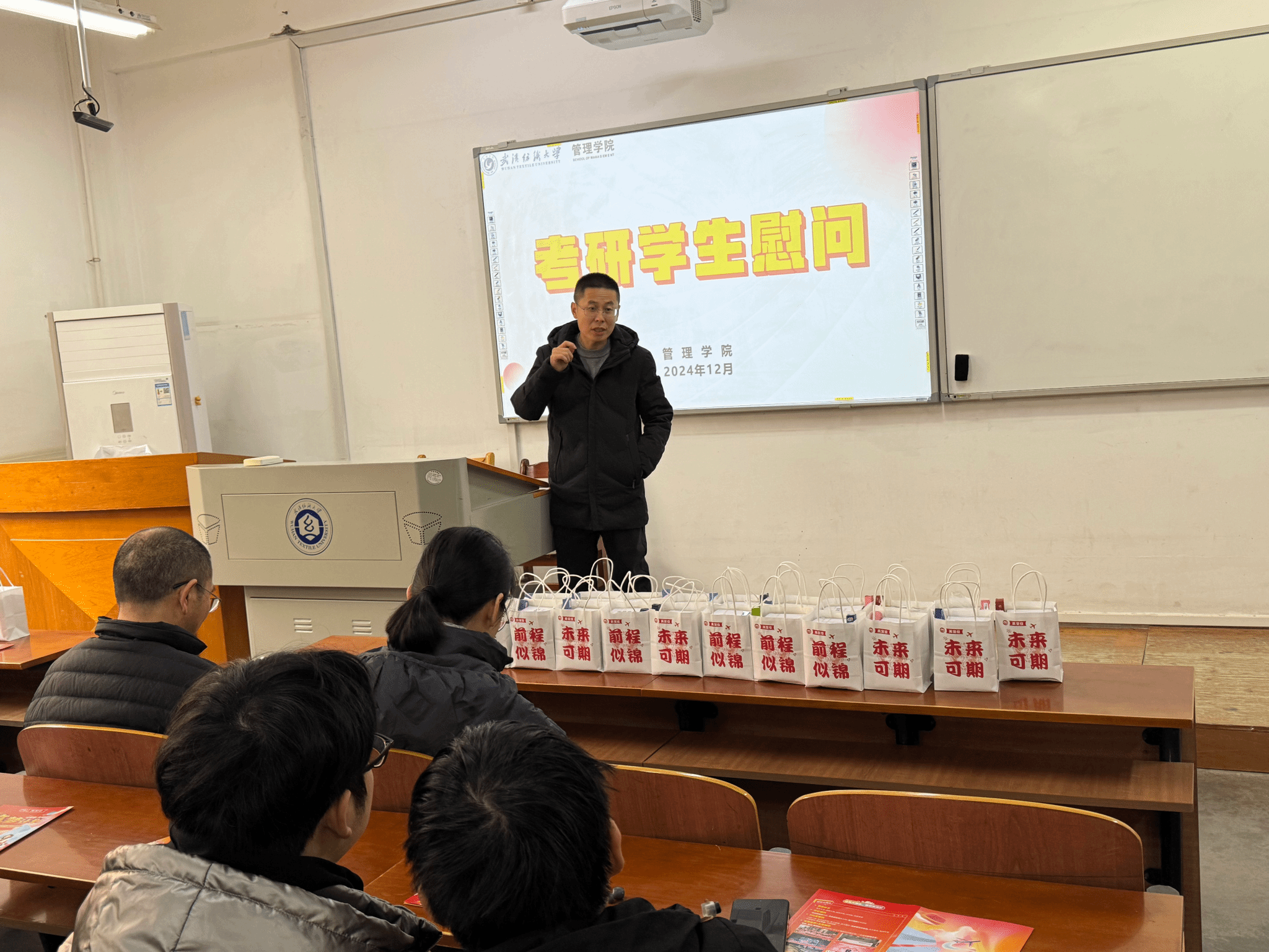 耿迪提醒同学们在复习期间学会调整心态,注意劳逸结合,有任何问题可及时与学院老师联系。活动最后,各位老师为同学们分发了精心准备的慰问礼包,礼包承载着学院对考研学子深深的祝福,祝福大家都能金榜题名,成功上岸。