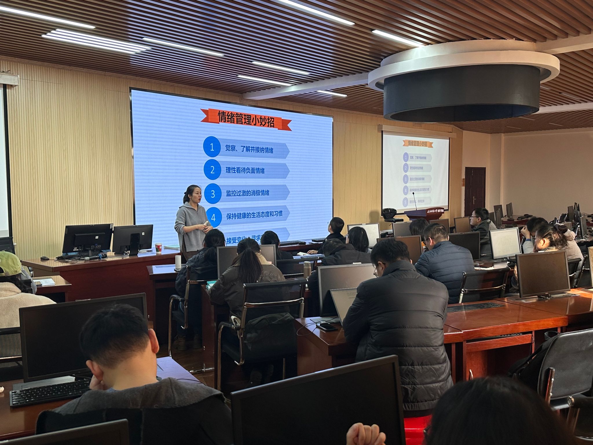 田媛教授以“享受工作,从心出发,自我赋能”为题,从生活中的家庭情绪引入,从“合理对待情绪、妥善处理关系、真切关照自己”三个方面展开,提出“渡人先渡己”的理念,强调教师身心健康对学生发展的重要性。在情绪管理上,田教授分享了情绪的识别与调适技巧,强调觉察并接纳情绪的重要性,倡导保持健康的生活方式和理性看待负面情绪。在人际沟通方面,田教授提出积极倾听、非暴力沟通和共情技巧,帮助教师更有效地建立和谐的人际关系。针对如何与自己相处,田教授通过心理学理论和实际案例,强调关注内心需求和寻求平衡的重要性,呼吁教师以热爱为动力,追求职业幸福与个人成长。