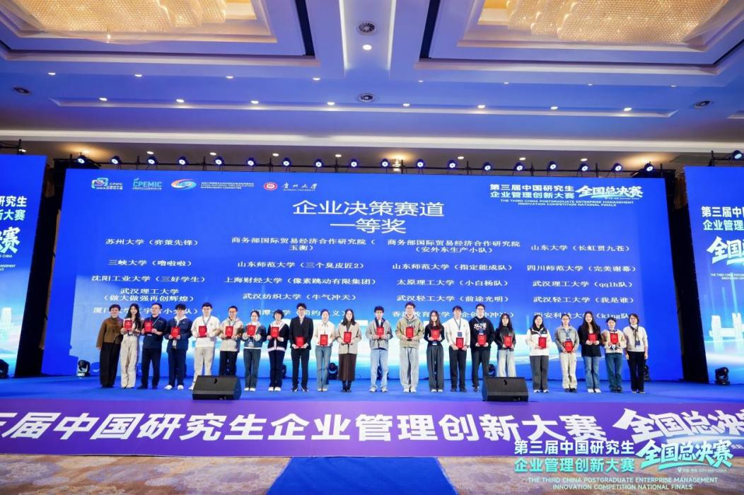 经过激烈角逐,bat365正版唯一官网余牛指导的“牛气冲天”队(成员:丁俊达、蔡瑾耀、陈嘉灏)荣获企业决策赛道全国一等奖、万欣指导的“开心总动员”队( 成员:刘书洋、程佳欣、张佳瑶)和魏文川指导的“奇迹小组”队(成员:郭红霞、何苹格、柯寅)分别荣获企业决策赛道全国二等奖,这得益于学校和学院的大力支持,充分体现了学院在研究生教育方面的扎实功底与育人成果。