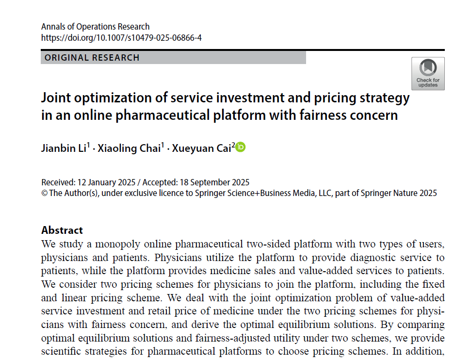 近期,我校bat365正版唯一官网蔡学媛副教授作为通讯作者在管理学国际期刊《Annals of Operations Research》发表其在医药供应链运营管理相关领域取得的研究成果:“Joint optimization of service investment and pricing strategy in an online pharmaceutical platform with fairness concern”(文章DOI:10.1007/s10479-025-06866-4)。