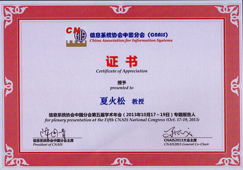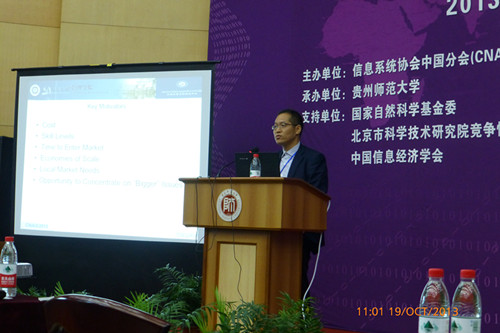 近日,国际信息系统协会中国分会第五届学术年会(CNAIS2013)在贵州师范大学召开,大会邀请了国际知名的Paulo Goes教授(MIS Q 主编,University of Arizona),国际期刊ECRA联合主编、美国伊利诺伊大学芝加哥分校的Christopher Westland教授作了特邀报告,共有国际、国内专家学者约400人参加了会议。本次大会的主题为“大数据背景下的信息系统研究与实践”。 我校bat365正版唯一官网夏火松院长、教授应邀出席了会议。
