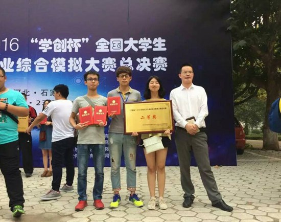 9月25日,2016“学创杯”年全国大学生创业综合模拟大赛全国国赛在河北经贸大学隆重举办。国家级实验教学示范中心联席会经管学科组主办的2016“学创杯”全国大学生创业综合模拟大赛决赛暨颁奖典礼在河北经贸大学落下帷幕。经过激烈角逐,我校bat365正版唯一官网罗建军老师指导的“青柠队”(团队成员:李雅辉、李甲川、韩丰玲)荣获全国总决赛二等奖。