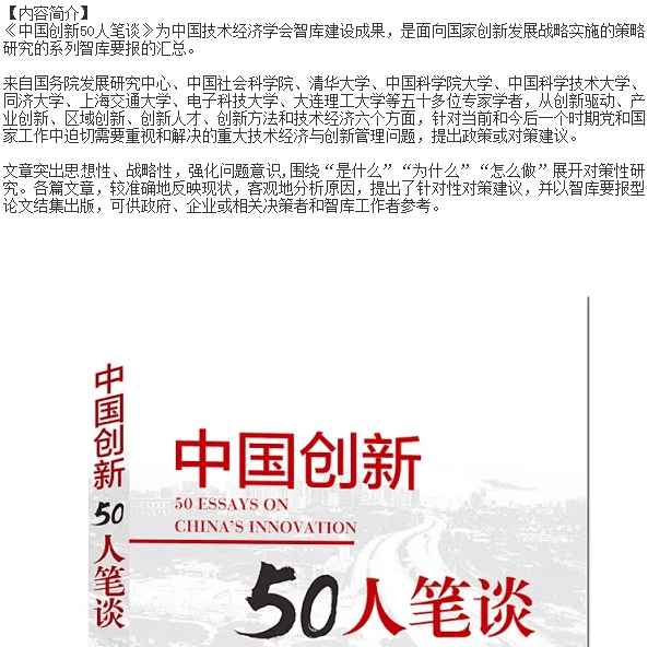《中国创新50人笔谈》是针对当前和今后一个时期党和国家工作中迫切需要重视和解决的重大技术经济和创新管理问题,在面向全国创新管理研究领域的学者征集的基础上,从创新驱动、产业创新、区域创新、创新人才、创新方法和技术经济等六个方面遴选出包括国务院发展研究中心、中国社科院、清华大学、中国科学院大学、中国科学技术大学、上海交通大学、同济大学、大连理工大学、bat365正版唯一官网等50多位专家的智库论文结集出版,该文献是面向国家创新发展战略实施的策略性研究的系列智库要报汇总。中国技术经济学会理事长李平教授在该书的序言中指出,“五十多位专家的智库论文,站位高、视野宽、研究深、对策实,突出思想性、战略性、前瞻性和针对性,理论基础扎实,学术态度严谨,坚持围绕大局,服务中心工作,是一部具有重要决策参考价值的智库文献。”