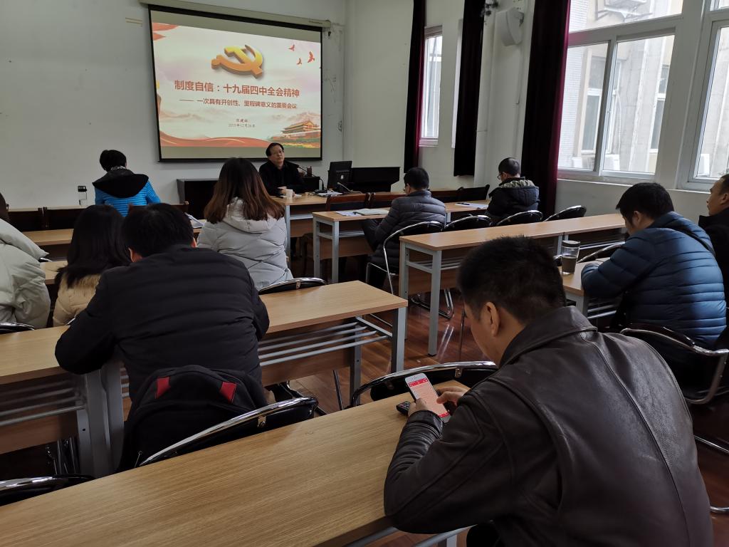 按照学校党委统一部署,12月26日下午,学习贯彻党的十九届四中全会精神学校党委宣讲团成员、马克思主义学院张建林教授,为bat365正版唯一官网全院教职工作了一场专题宣讲报告。bat365正版唯一官网党委书记滕胜娟主持宣讲报告会。