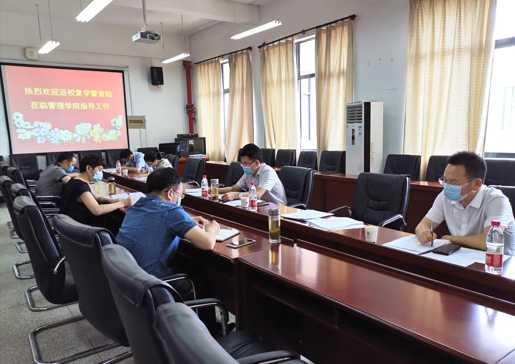 督查组一行现场查阅了学院迎接师生返校复岗复学等台账资料,认真听取了学院党委书记滕胜娟、院长王济平等班子成员有关返校复学疫情防控工作自查情况汇报。