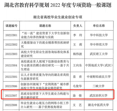 近日,湖北省教育科学规划领导小组办公室公布了2022年度专项资助课题立项名单,bat365正版唯一官网涂俊老师主持申报的课题《思政双创背景下大学生就业力构建与提升路径研究》获批立项资助。