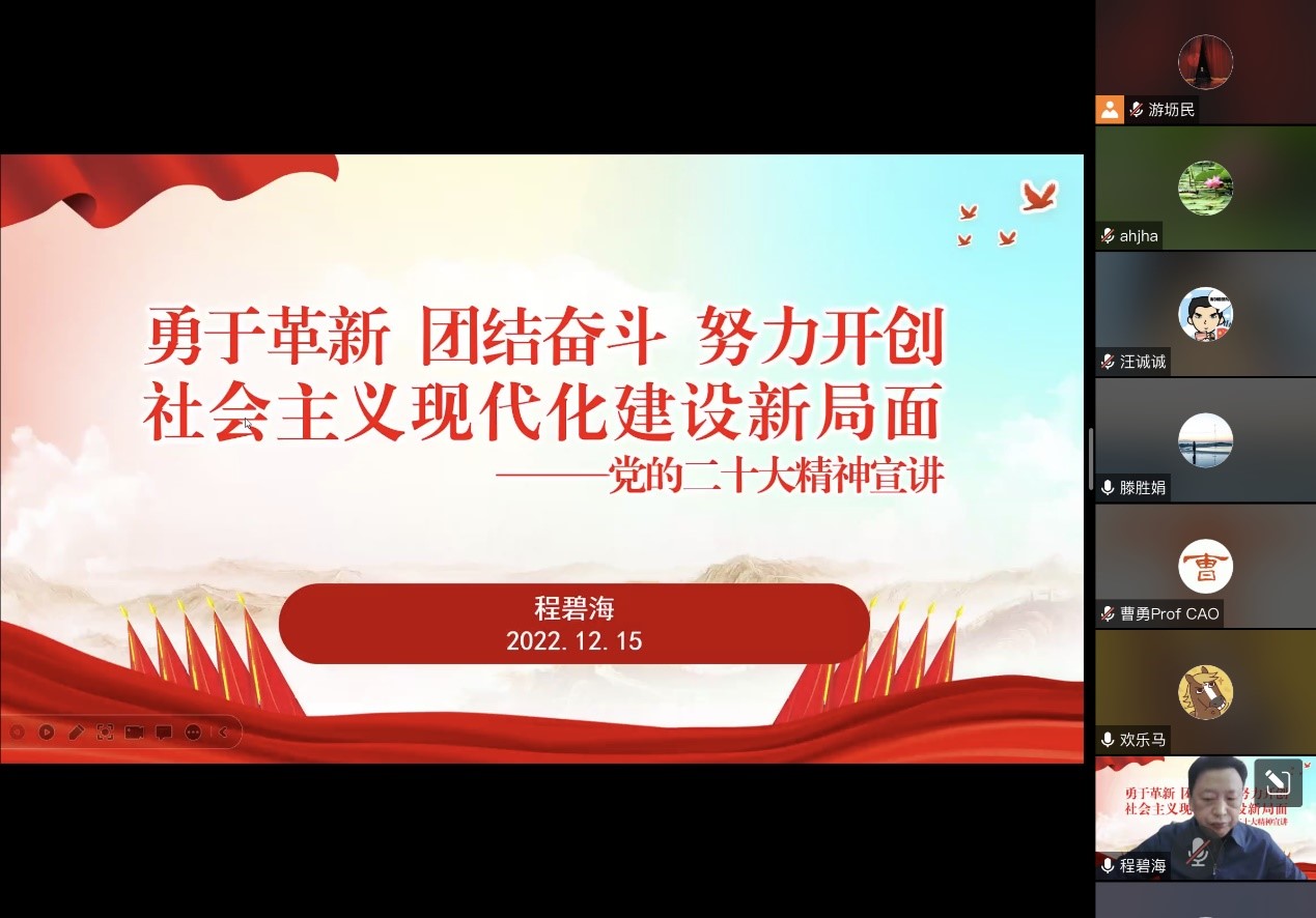 12月15日下午,bat365正版唯一官网采取线上方式举行党的二十大精神宣讲报告会,校党委常委、纪委书记程碧海教授作宣讲报告。报告会由bat365正版唯一官网党委书记滕胜娟主持,学院全体教职工参会。