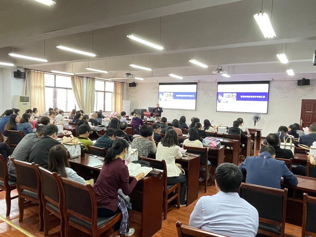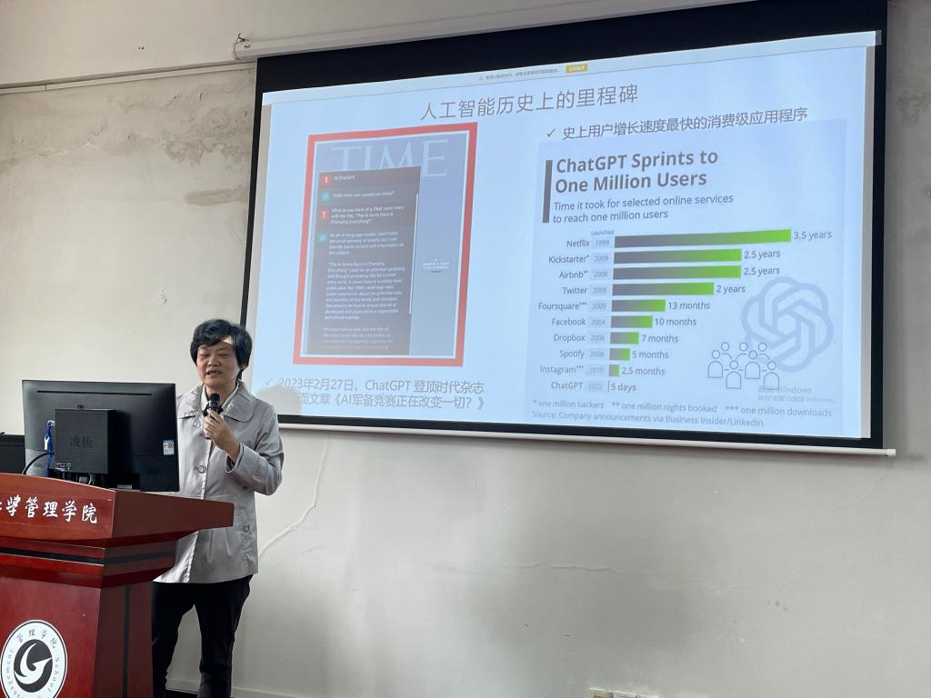 会议还邀请万欣副教授做《智领未来-走近ChatGPT》汇报, 万教授从ChatGPT的发展历程、实用价值、应用现状及前景展望做了具体的分析与汇报,并以实际的教学与工作上的案例做了经验分享与交流,赢得了阵阵掌声。
