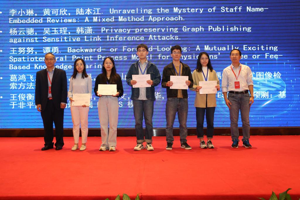 大会还颁发了第三届数据智能与管理学术“优秀论文奖”和“优秀论文提名奖”,本届大会主席夏火松教授、吴俊杰教授为获奖论文作者颁发了证书。