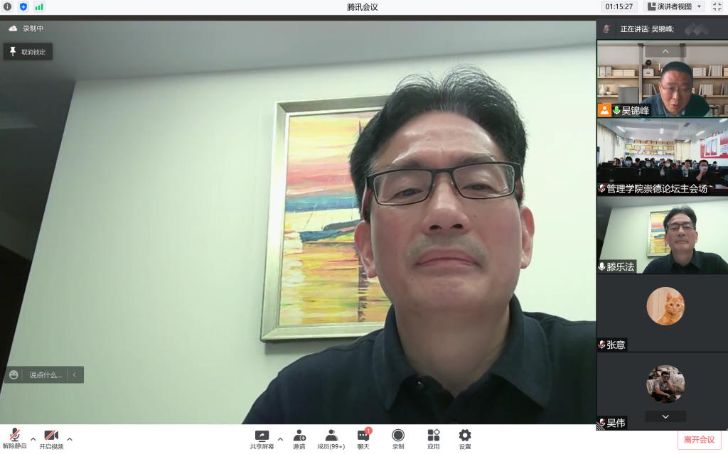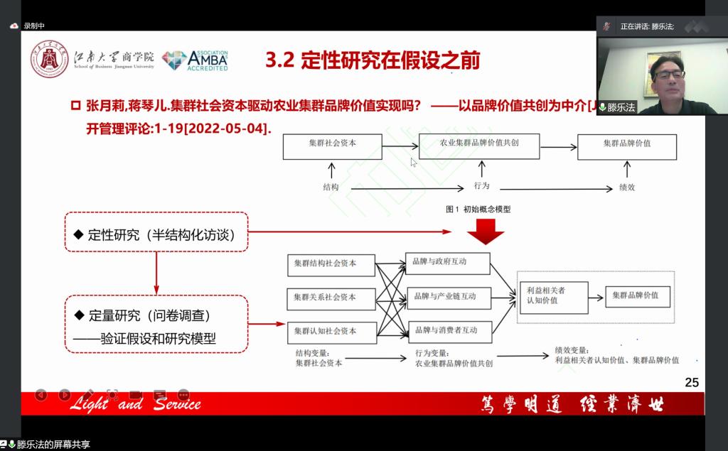 5月12日下午,江南大学质量品牌研究院执行院长滕乐法教授受bat365官网邀请进行线上讲座,拟通过本次讲座为bat365官网研究生在论文研究方法及应用提供帮助与指导。本次讲座由bat365正版唯一官网副院长吴锦峰教授主持,bat365正版唯一官网部分教师出席,全体研究生积极参会。