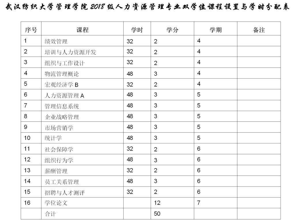 攻读本专业双学士学位的学生,应获得总学分不少于50学分,包括毕业论文12学分。具体课程设置及学分要求见课程设置与学时分配表。