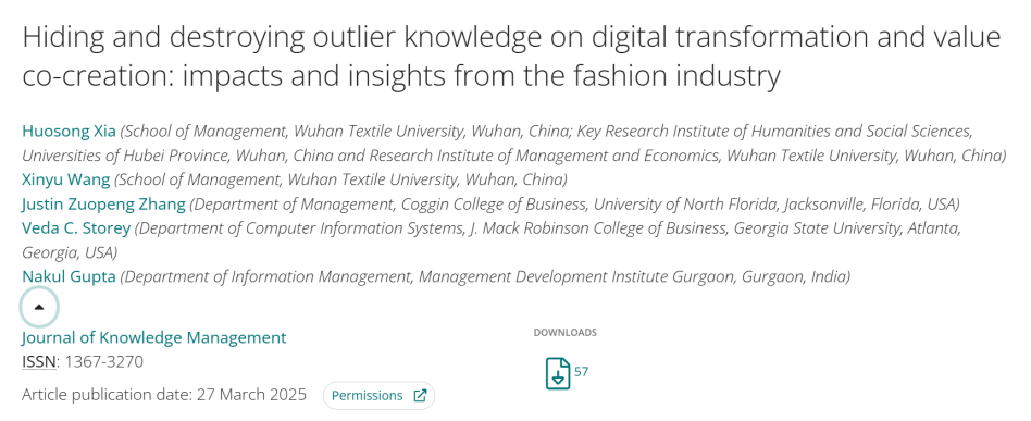 近日,bat365正版唯一官网夏火松教授团队联合美国北佛罗里达大学、乔治亚州立大学等机构在知识管理领域国际顶尖期刊《Journal of Knowledge Management》发表题为《Hiding and destroying outlier knowledge on digital transformation and value co creation: impacts and insights from the fashion industry》的高水平研究论文(DOI:10.1108/JKM-08-2024-0950)。该研究通过探索性单案例研究,首次构建异类知识管理理论框架,揭示时尚企业如何通过数字化转型实现可持续价值共创。论文第一作者为夏火松教授,bat365正版唯一官网为第一作者单位,2022级管理科学与工程学术研究生王欣雨为论文第二作者。