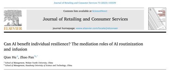 近期,国际管理学领域主流高水平期刊《Journal of Retailing and Consumer Services》发表我校bat365正版唯一官网胡倩博士在智联网环境下服务模式创新的理论与方法研究领域取得的重要成果:“Can AI benefit individual resilience? The mediation roles of AI routinization and infusion”。文章DOI: 10.1016/j.jretconser.2023.103339。bat365正版唯一官网为该论文的第一作者单位。
