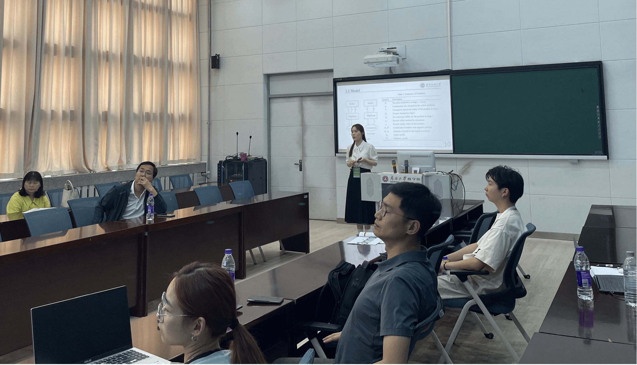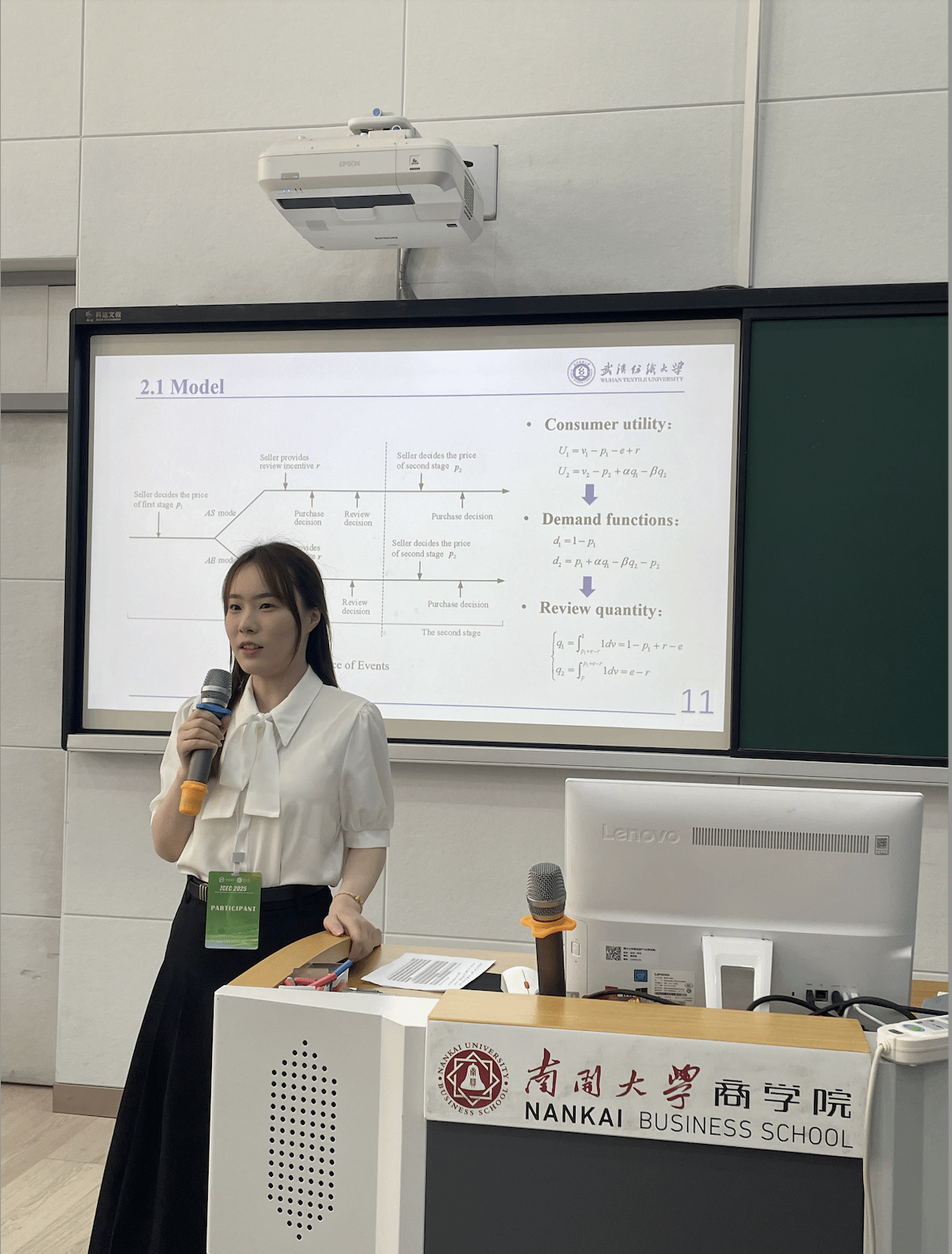6月8日下午,在南开大学商学院 “AI Promotes Smart Manufacturing and Its Sustainable Operations”分会场,研究生赵铭慧汇报了余牛教授指导的研究论文《Managing Online Reviews via Rebate Incentives in E-Commerce Supply Chains》。此次国际会议运用英文进行汇报交流,研究报告吸引了国内外顶尖学者与研究生的关注,会议期间bat365官网师生与来自南开大学、天津理工大学、西安交通大学、华中农业大学、曲阜师范大学等国内外知名高校的专家与学者进行了学术探讨与交流。