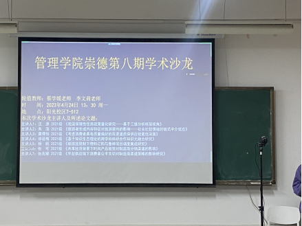 bat365正版唯一官网于4月24日在阳光校区举办了第八期“崇德”学术沙龙,给广大学术旅途上的学子催生新的学习想法,积攒科研知识。本次学术沙龙在07-512进行,共有7位同学对自己的研究近况进行展示。学院特邀蔡学媛老师和李文莉老师参与主持此次论坛并发表点评。