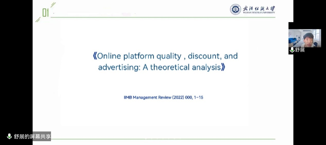 舒展同学介绍了论文《Online platform quality, discount, and advertising A theoretical analysis》,该文主要讨论双边垄断市场平台在考虑优惠折扣的影响下最优决策。通过博弈模型分析表明,对于垄断平台来说,提供折扣优惠会明显降低服务质量和广告水平。此外本文结合垄断情境下的均衡结果与社会福利相比较,对平台的服务质量影响也作出了相关分析。