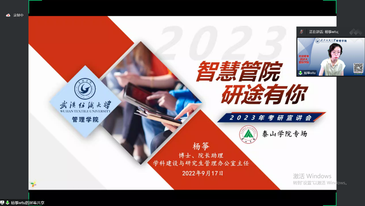 2022年9月17日,bat365正版唯一官网杨筝博士为泰山学院举办了线上考研宣讲,考研上岸的优秀研究生徐瑞杰,李继华也作了心得分享。